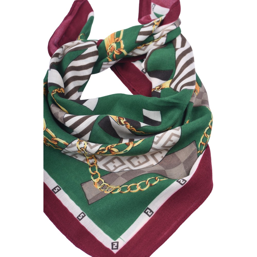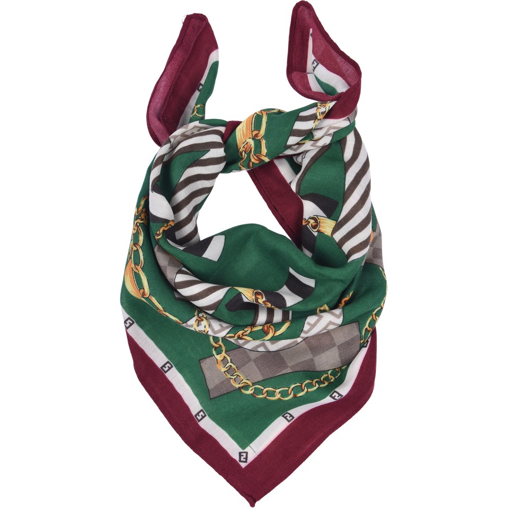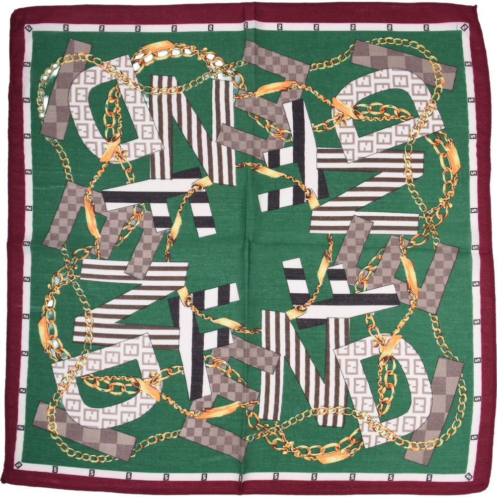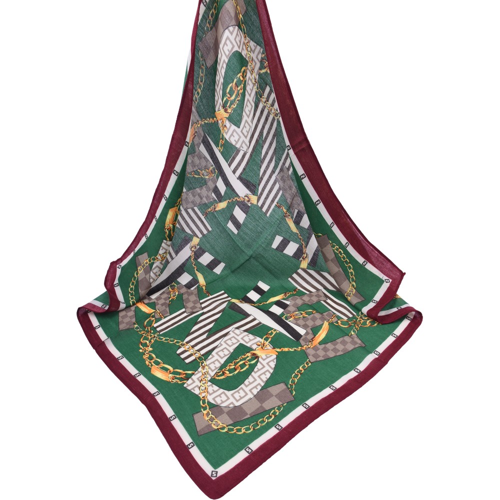 Zielona apaszka z bordowym obramowaniem, na której umieszczono wyrazisty motyw złotych łańcuchów oraz duże, graficzne litery z paskami. Wykonano ją w 100% z miękkiej wiskozy, a jej kwadratowy format 70×70 cm ułatwia tworzenie różnorodnych węzłów pod szyją. Odważny wzór skutecznie ożywia gładkie, jednolite stylizacje