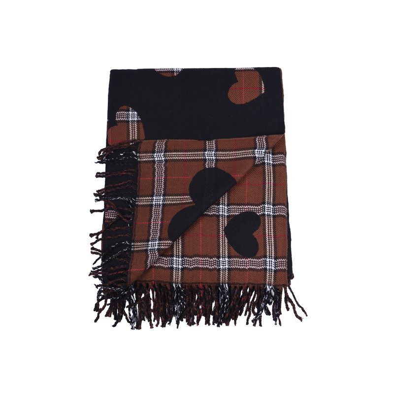 Klasyczna czerń w zupełnie nowym wydaniu. Ten szalik to propozycja dla kobiet, które lubią łączyć elegancję z odrobiną luzu. Ciemne tło, przełamane jasną kratą i czerwonymi serduszkami, tworzy efektowny kontrast, który ożywi każdy zimowy płaszcz.
