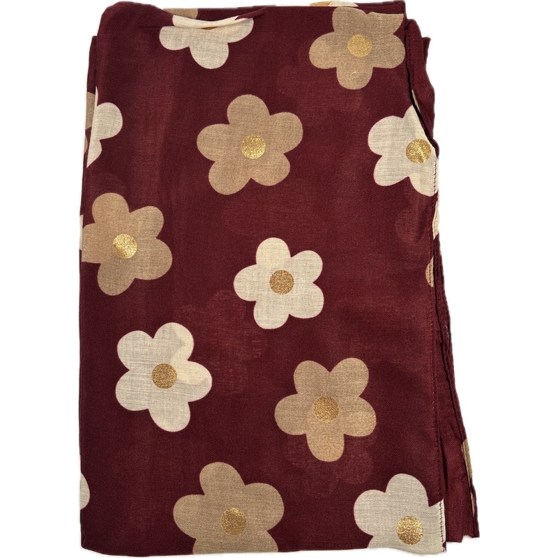 Wyrazisty bordowy kolor tworzy tło dla dużych, kremowych i beżowych kwiatów, a złote środki dodają blasku i luksusowego wykończenia. Szalik ma starannie obszyte brzegi, bez frędzli – dzięki temu łatwo go zawiążesz według własnego stylu. Szerokość 90 długość: 180 cm. Materiał nie gryzie, pozostaje miękki i przyjemny dla skóry, nie mechaci się w trakcie użytkowania. To uniwersalny dodatek na co dzień i na specjalne okazje.