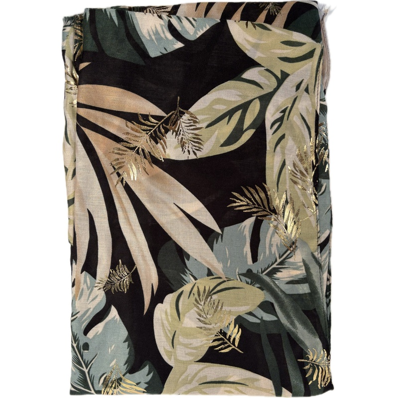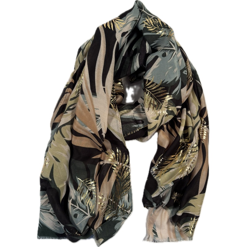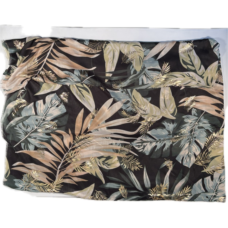 Ten wyrafinowany szalik cienki to wyjątkowy dodatek o tropikalnym charakterze. Beżowe tło tworzy elegancką bazę dla egzotycznego wzoru. Dominują w nim złote liście monstery i inne tropikalne rośliny. Delikatne zielone akcenty dodają świeżości.