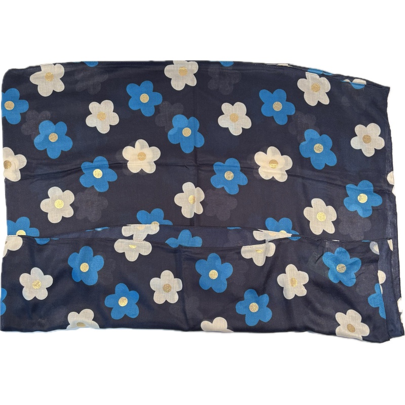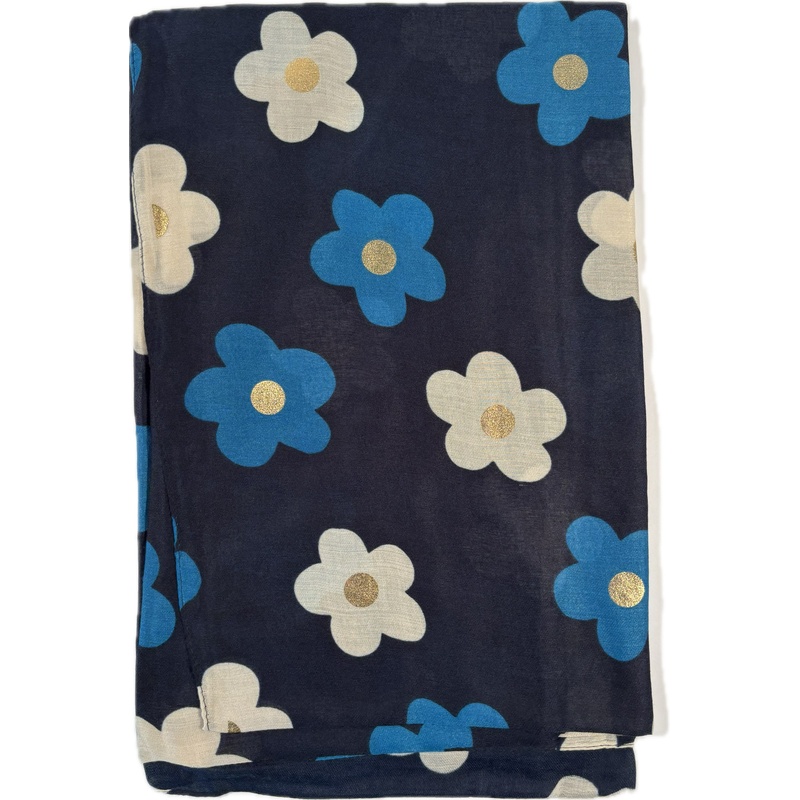 Ten urokliwy szalik cienki to wyjątkowy dodatek o kwiatowym charakterze. Granatowe tło tworzy elegancką bazę dla wesołego wzoru. Dominują w nim duże kwiatki w dwóch wersjach kolorystycznych. Niebieskie i białe kwiaty ze złotymi środkami tworzą radosną kompozycję.