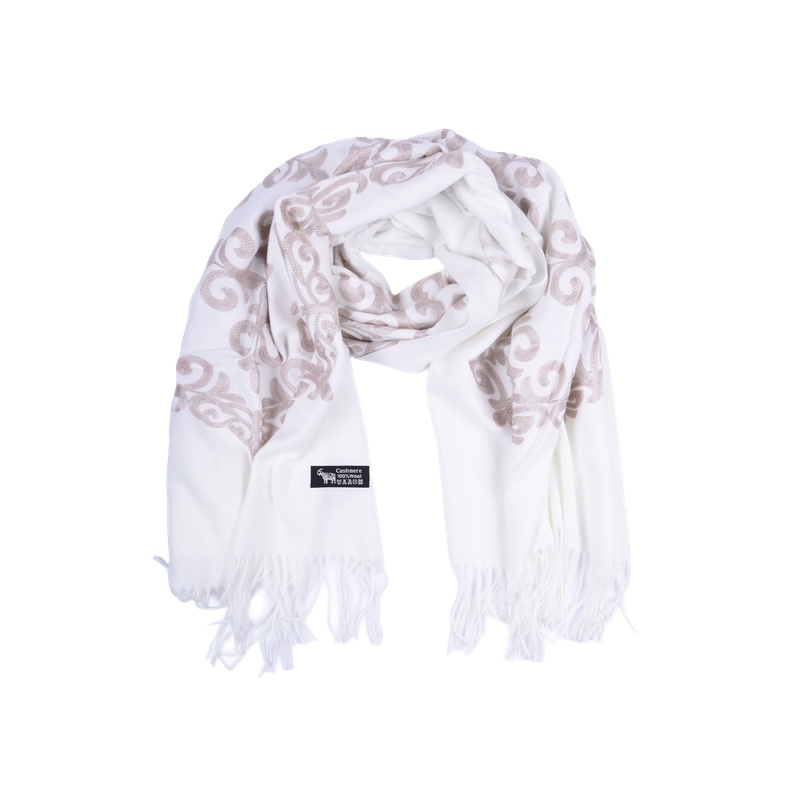 Szalik kaszmirowo-wełniany biały ornament barokowy z frędzlami