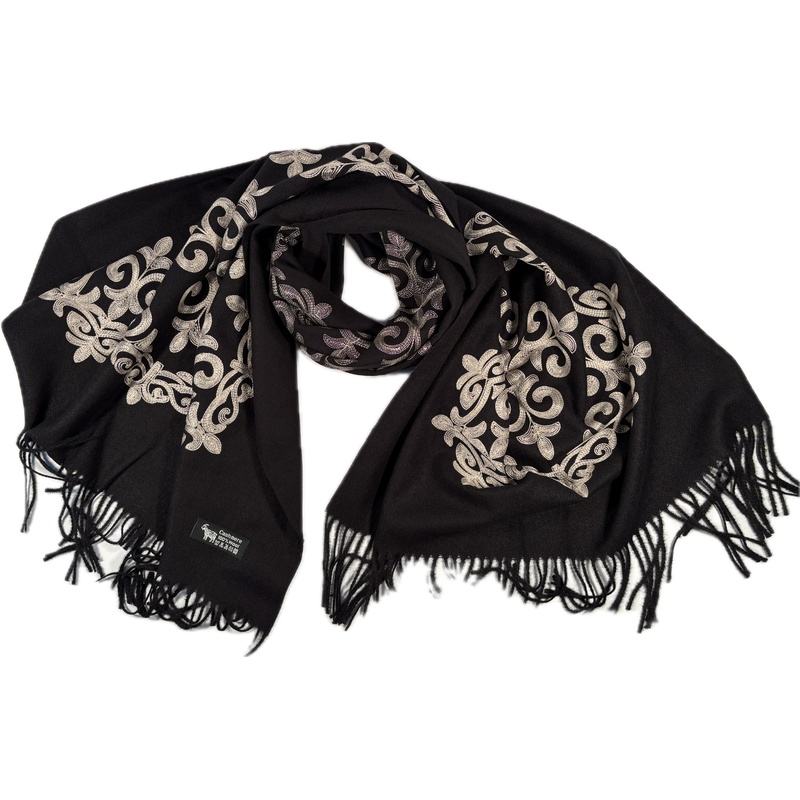 Szalik kaszmirowo-wełniany czarny ornament barokowy stanowi luksusowy akcent, który od razu przyciąga wzrok. Skład 50% kaszmiru i 50% wełny zapewnia wyjątkową miękkość i doskonałą termoizolację.