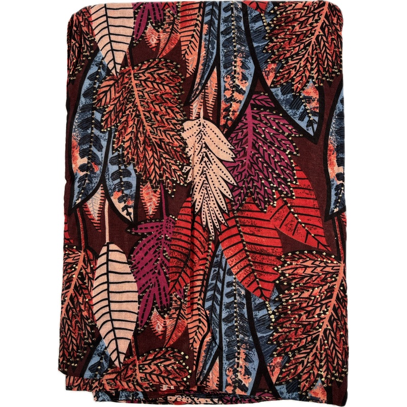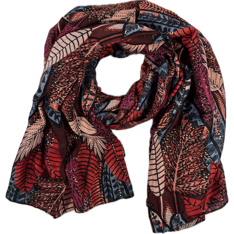 Szalik w kolorowe liście burgundowe, niebieskie ze złotymi zdobieniami to oryginalny dodatek, który wyróżni każdą stylizację. Materiał jest lekki i przyjemny, sprawdza się przez cały rok.