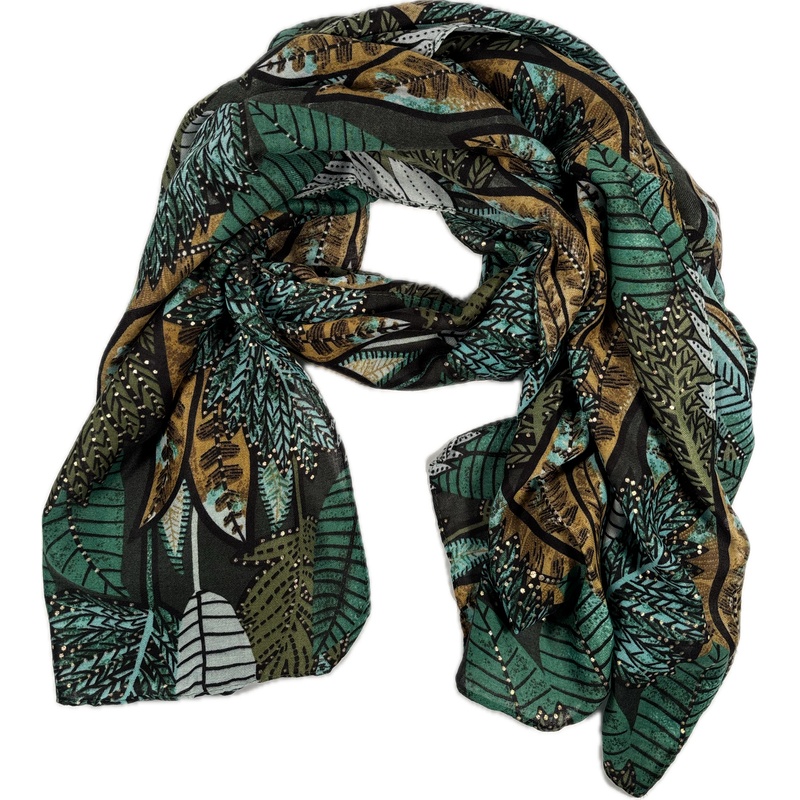 Intensywny wzór liści w odcieniach zieleni, turkusu i żółci wyróżnia złota aplikacja – delikatne kropki podkreślają nadruk. Brzegi są gładko obszyte bez frędzli, a wymiary 180×90 cm pozwolą na różne sposoby wiązania. Materiał nie gryzie i zachowuje kolory nawet po wielu praniach. Szalik jest lekki, nie obciąża szyi, świetny jako apaszka lub klasyczny szal.