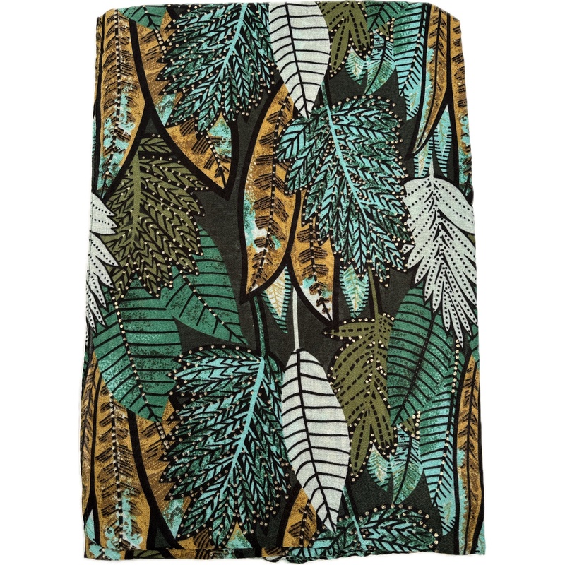 Szalik w kolorowe liście zielone, żółte ze złotymi zdobieniami przyniesie powiew egzotyki do Twojej garderoby. Lekka, miękka tkanina zapewnia wygodę i przewiewność, sprawdzi się przez cały rok.